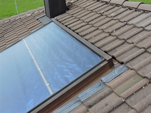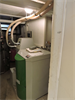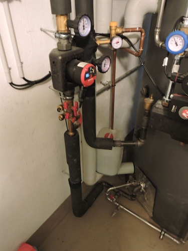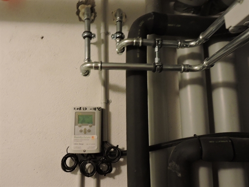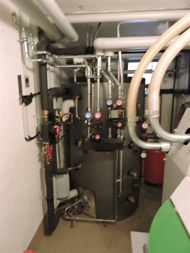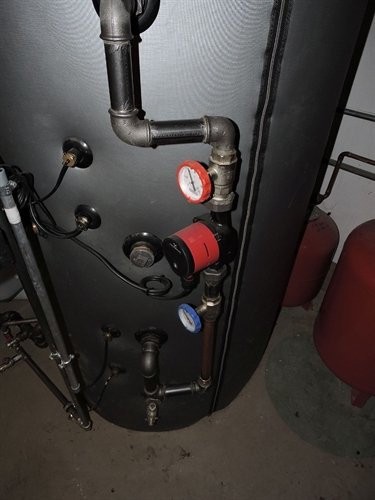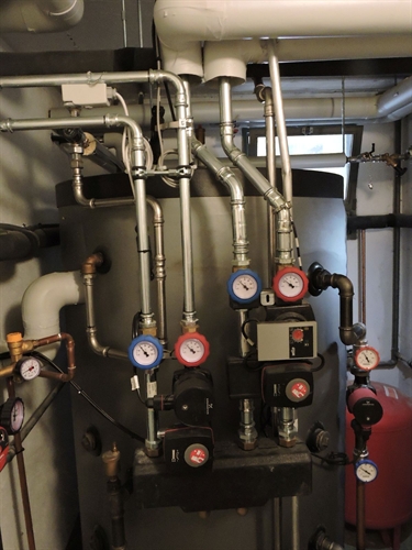 | Par devant, tout à fait discret 5 | | Par dessus 10 | | 15 | | 20 | | 25 | | 30 | | Chaufferie. Accu spira existant, marque inconnue, aucune spécification technique ni dessus (étiquette) ni ailleurs, cependant prévu pour l'ajout du solaire thermique, bien, mais avec un seul serpentin en bas, beaucoup moins bien. Mais le propriétaire ne pouvait pas savoir : c'est l'installateur d'alors qui lui a mis du cheap minimaliste sans trop se préoccuper de l'avenir. Il est probable que sans la demande du propriétaire, l'accu n'aurait même pas été prévu pour le solaire thermique. Solaire à gauche. Groupe charge et distribution existants au centre.