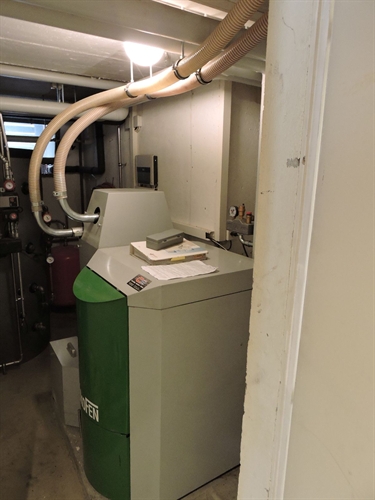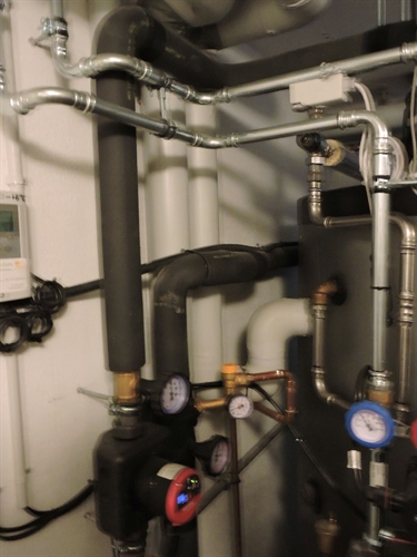 Il faut mettre une pompe dite de 'destratification' qui tourne la nuit pour brasser les 2/3 du volume d'accumulation en même temps que la régulation solaire lance la décharge nocturne via l'échangeur du bas. La programmation additionnelle que cela nécessite fait partie du module bureau d'apprentissage pour les apprentis niveau intermédiaire. Oui ça veut dire qu'au niveau intermédiaire les apprentis en savent déjà plus que les autoproclamés professionnels d'alors. Il est compréhensible que leurs adresses ne figurent pas sur notre site :-). 130 | | Ici la mini-chaudière à granulés d'origine, en arrière-plan les tuyaux d'aspiration depuis le silo. 200 | | Vue rapprochée. A gauche un pu derrière, charge chaudière, non isolée, mais étonnamment avec les siphons, le propriétaire a du insister alors. Au cntre (à priori) deux distributions chauffage, à droite la pompe de destratification. 205 |