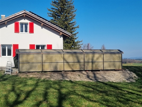 | Ici vue arrière du bucher-champ solaire. Ca a déjà une sacrée gueule. A des années lumières du vomi moche sur tuiles de panneaux. Et ce n'est pas fini : la végéralisation n'est pas encore là. Quand ce sera fini, non seulement ça produira massivement de l'énergie utile pour l'autonomie de la maisons, mais on pourra inviter Pro Natura pour leur faire sentir la différence, en matière d'énergie renouvelable, entre l'écologie d'en-bas que l'on voit ici et le technocratisme cantonal sous influence des lobbies pour alimenter les machines Involuer Artificielles (IA pour le mainstream, y compris journalistique, qui a abdiqué le souci du sens des mots). 200 |