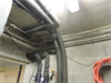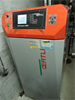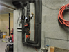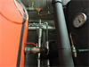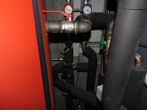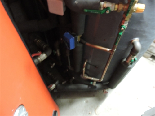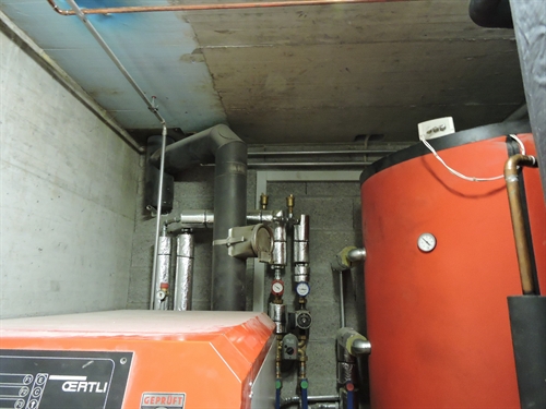 | Les accus, à droite, au premier plan à droite en bleu sombre, le nouvel accu Jenni de 1000L (qui ainsi passait la porte), et a l'arrière plan derrière en orange, l'accu de 1000L originel, de volume alors insuffisant pour la chaudière à buches de 50kW à gauche (admet des bûches de 50) 150 |