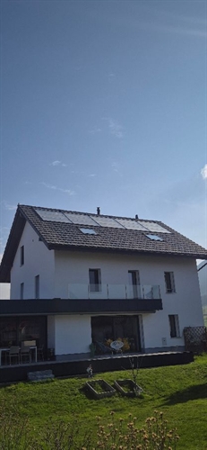 << J'ai bien terminé mon installation solaire qui fonctionne à merveille. Je dispose de 2 champs, un pour le soleil levant contre la face des garages et l'autre champ plus conséquent sur le toit de la maison. Autres sources d'énergie : le poêle hydro Powal Phoenix et la chaudière à mazout existante en dernier recours. Consommation annuelle: env. 3 stères de bois et 800 litres de mazout. La maison dispose de 2 appartements + une petite maison annexe qui est chauffée à distance, c'est le vestiaire et local de douches pour mon entreprise de ramonage, le tout pour environ 1000 m3.