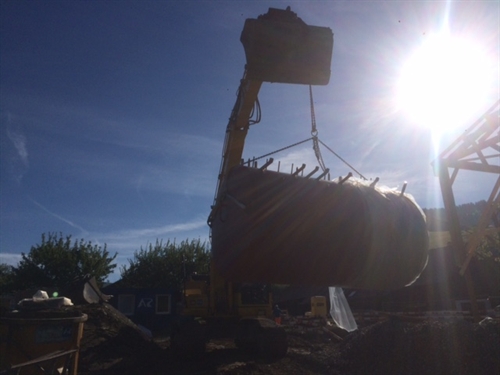 Le caractère particulier de cette réalisation, c'est que le propriétaire joue le rôle de concierge et que la chaudière est dans son salon. Des indications de la température de la cuve = de sa charge par le solaire, lui permettront de décider si oui ou non il met du bois pour l'immeuble, sans recours au moindre pet de domotique (qui selon un article dans Efficience 21 en 2012, couterait sinon entre 2 et 8% du coût de la construction, et on passe la pollution électromagnétique et tout le reste...). Il a a aussi d'autres bonnes choses dans cette installation mais elles sont top secret.