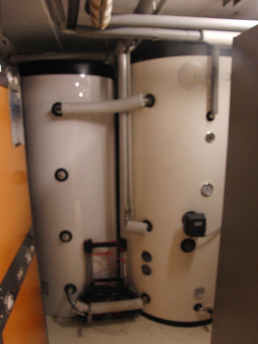 Enfin, on pourrait agrapher des bouts de feuille sélective sur l'absorbeur. Une simple agrafeuse à percussion avec des agrafes costaud peut faire l'affaire. Le tout est de viser juste et pas percer les tubes dessous :-) Les agrafes n'ont pas besoin d'être retournées : il suffit que la feuille sélective soit bien en contact avec le métal de l'absorbeur dessous pour que l'échange radiatif entre deux plaques quasi jointives aux points ou elles se touchent pas soit quasi aussi bon qu'aux points ou elles se touchent. C'est le moyen le plus simple et rationnel d'améliorer un absorbeur non sélectif. 7 | | Ici vue de la régulation domestique à l'étage. 10 | | Les deux chauffe-eau à la cave. A l'origine il y avait un combiné de 600L avec un ballon email en haut pour l'ECS de 400L, et un tank eau morte satellite de 600L en satellite. Le système avait le défaut, il l'a toujours preuve que 40 après les installateurs n'ont toujours pas appris, de n'être pas connecté tout en haut ce qui fait que le haut du combiné ne pouvait pas s'équilibrer en température avec le haut du satellite, privant ainsi la part ECS en haut d'un peu de capacité de stockage. En 2016 le boiler interne emaillé du combiné à percé, et de l'eau sanitaire commença alors à aller dans l'eau morte. Et en contrepartie l'ECS cessait d'être potable. Au vu de la durée de vie du boiler interne, on ne peut pas se plaindre ; c'est bien au-delà de la durée de vie de 15 ans typique pour un chauffe-eau émaillé. Mais cela montre quand même que, comme on le dit au cours, il en faut pas prendre de combinés avec des boilers internes émaillés car leur durée de vie est limitée et quand ils percent il faut tout changer. C'est pour cela que depuis toujours, on prend des boilers combinés avec le chauffe-eau interne inox, increvable.