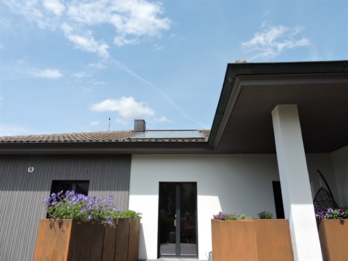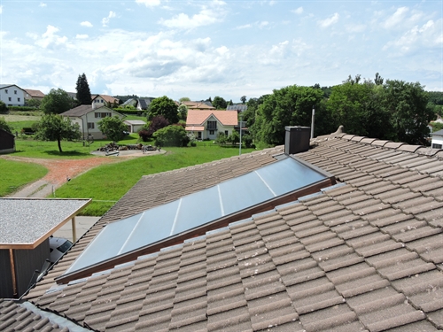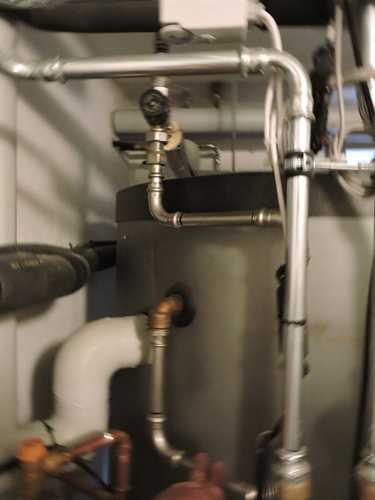 | Par devant, tout à fait discret 5 | | Par dessus 10 | | 15 | | 20 | | 25 | | 30 | | Chaufferie. Accu spira existant, marque inconnue, aucune spécification technique ni dessus (étiquette) ni ailleurs, cependant prévu pour l'ajout du solaire thermique, bien, mais avec un seul serpentin en bas, beaucoup moins bien. Mais le propriétaire ne pouvait pas savoir : c'est l'installateur d'alors qui lui a mis du cheap minimaliste sans trop se préoccuper de l'avenir. Il est probable que sans la demande du propriétaire, l'accu n'aurait même pas été prévu pour le solaire thermique. Solaire à gauche. Groupe charge et distribution existants au centre.