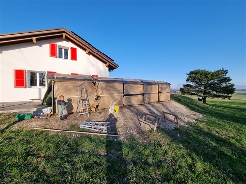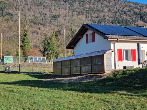 | Ici vue arrière du bucher-champ solaire. Ca a déjà une sacrée gueule. A des années lumières du vomi moche sur tuiles de panneaux. Et ce n'est pas fini : la végéralisation n'est pas encore là. Quand ce sera fini, non seulement ça produira massivement de l'énergie utile pour l'autonomie de la maisons, mais on pourra inviter Pro Natura pour leur faire sentir la différence, en matière d'énergie renouvelable, entre l'écologie d'en-bas que l'on voit ici et le technocratisme cantonal sous influence des lobbies pour alimenter les machines Involuer Artificielles (IA pour le mainstream, y compris journalistique, qui a abdiqué le souci du sens des mots). 200 |