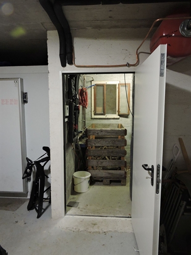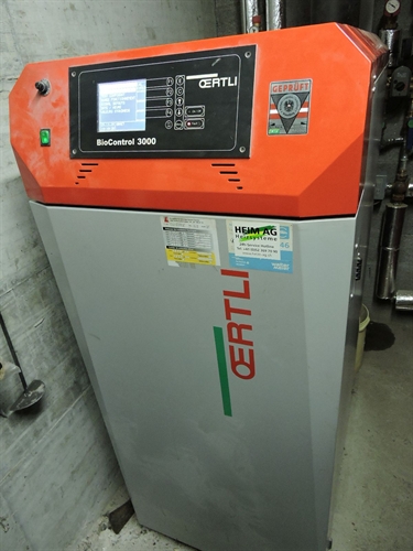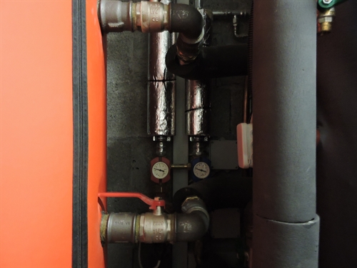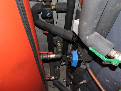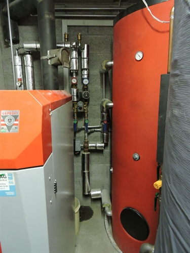 | Les accus, à droite, au premier plan à droite en bleu sombre, le nouvel accu Jenni de 1000L (qui ainsi passait la porte), et a l'arrière plan derrière en orange, l'accu de 1000L originel, de volume alors insuffisant pour la chaudière à buches de 50kW à gauche (admet des bûches de 50) 150 |