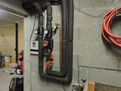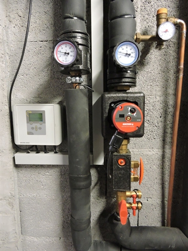 | Au fond le groupe de distribution chauffage avec sa 3-voies progressive 180 |