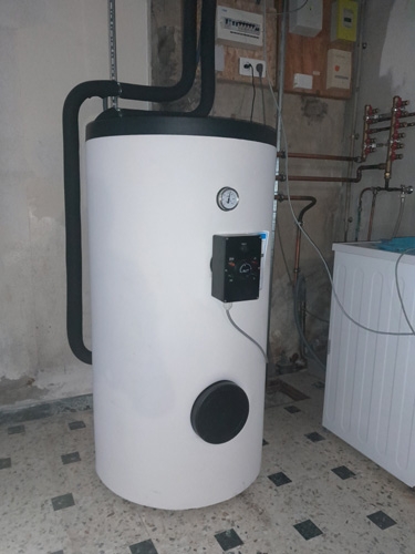 | Une réalisation de Cyril Goujon/Alternative solaire, la totale, 2 gros ballons tampons pas cher et échangeur à plaques pour le solaire, et charge distante sur un petit chauffe-eau de 200L |