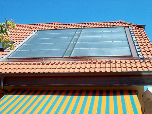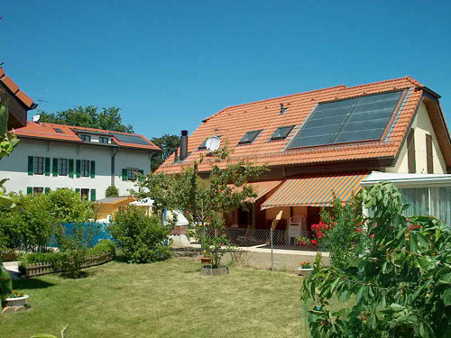 | Installation pour l'eau chaude, l'appoint au chauffage et le chauffage estival de la piscine. 15m2 de capteurs sur un toit idéalement exposé.