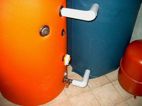 20 | | En raison de la largeur des portes (70 cm environ) et de la nécessité d'avoir un certain volume de stockage de chaleur, on utilise 2 accumulateurs reliés par 3 tuyaux de gros diamètre. De cette manière, même si un seul accumulateur est chauffé au solaire, les deux accumulateurs fonctionnent comme un seul plus gros.