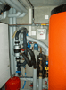 11 | | Peu de place en cave. On voit ici notamment l'échangeur de chaleur pour la piscine, connecté au circuit piscine par les tuyaux qui traversent le mur du fond, circuit qqui passe dans un SOMO sous la terrasse entourant la piscine. La pompe de filtration et le by-pass sont situés en bout de piscine. En hiver le circuit est vidé (robinet de vidange sous l'échangeur).