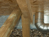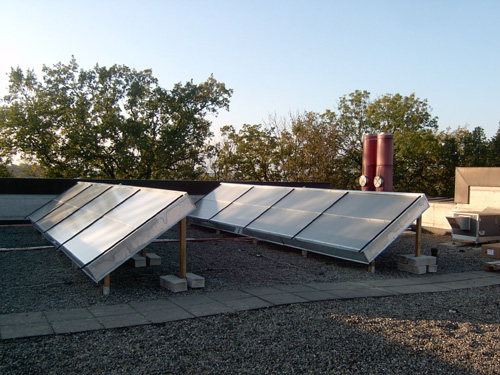 | Une construction solaire en camp didactique, sous la supervision de Sergio Mazzone. Malheureusement les organisateurs (trop stressés ?) ont oublié d'immortaliser quelques moment de la construction et il n'y a aucune photo de l'action des jeunes pendant le camp. Voilà qui est dommage. Il ne reste plus qu'à parler technique : 42m2 en 4 champs sur toiture, avec un système de support à partir de bois et d'éléments de fixation d'une autre nature que les brides articulées habituelles font une belle réussite esthétique. Un toit plat n'étant plat que dans la tête des ingénieurs de papier, il a été nécessaire d'ajuster chaque pilier pour donner une impression de "plat" à l'ensemble des champs. Ce qui a été possible parce que les piliers étaient... en bois. Si des éléments standardisés industriels, par exemple inox, avaient été utilisés, Murphy aurait frappé sans espoir de correction possible et les 4 champs solaires l'un derrière l'autre auraient donnée l'impression de subir une houle de mer... |