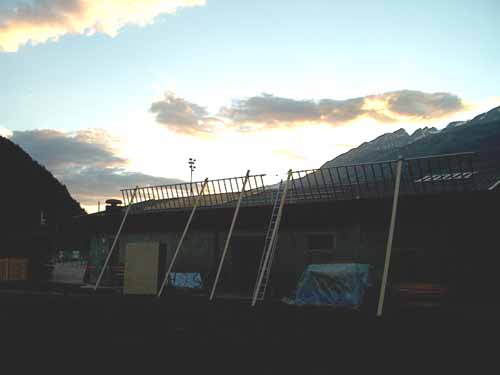 | Ce camp didactique est le second mené en langue allemande (cf. Naters), preuve que l'équipe est à présent bien rôdée à cet exercice. 28 élèves, pour une construction menée dans un un très beau cadre, sous un soleil insolent avec heureusement des nuages et du vent, au contraire de la semaine suivante, qui a vu Viège poser le record de chaleur suisse 2002 avec 37°C à l'ombre! Le Valais semble un abonné fidèle aux conséquences de l'effet de serre (pour mémoire cf. le camp solaire de Vouvry). Comme pour Naters, les absorbeurs ont été réalisés au préalable durant les séances de travaux manuels. |