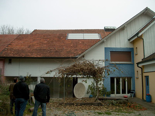 | Cet autoconstructeur réalise son installation via la construction collective de ses absorbeurs et la commande groupée du matériel en un seul lieu, temporaire et à proximité des installations à réaliser, ceci parce qu'un événement particulier avait lieu dans sa commune cf. http://www.sebasol.info/archives/2007/24h_070425a.jpg et http://www.sebasol.ch/archives/2007/dompierre/dompierre.jpg |