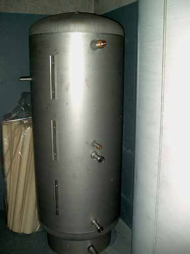 | Dito. La vanne de droite en bas est fermée car la partie gauche du circuit est en test de pression. En fonctionnement normal est bien sûr ouverte. Ces vannes permettent aussi de régler le débit solaire de manière à assure son passage à part égales dans chaque échangeur de chaque boillon, au cas où il y aurait un déséquilibre du au fait que les longeurs de lignes d'un côté et de l'autre ne sont pas tout à fait symétriques. On peut aussi voir sur le côté chaud un système de coupure et de vidange dessus/dessous (vannes à billes avec petite poignée rouge) qui permet, avec d'autres vannes sur le groupe de vider /remplir /faire circuler /tester alternativement la partie haute, basse, gauche ou droite du circuit. Un tel luxe n'est à notre connaissance JAMAIS rencontré dans une installation commerciale. Pour un descriptif détaillé d'un groupe solaire allez en fin de galerie de l'installation St-Léonard. 0 |