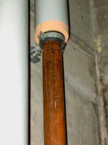 | Détail. Les flexibles qu'on voit ici sont des inoflex. Ils sont utilisés pour reprendre la dilatation des grandes longueurs de lignes. Dans ce cas ils résolvent en outre deux autres problèmes, en permettant le passage d'un angle et un changement de niveau. Beaucoup de firmes utilisent de tels flexibles pour l'entier des lignes. Selon notre expérience, le gain de temps ne vaut pas la peine du coût prohibitif de ce genre de matériel (même si gentiment, à force de chercher, on le trouve moins cher), car le travail de placement, mesure, forage, points fixes, bridage, protection par gouttières etc. constitue l'essentiel du temps de pose. Ici comme ailleurs, mieux vaut penser un peu plus d'abord afin de s'exciter moins ensuite. 0 |