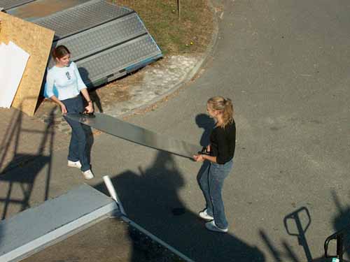 | Encore un toit de tôle ondulée. Situation le lundi 2 octobre. On peut y voir les planches disposées pour les déplacements et en bas le garde corps de sécurité 0 |
