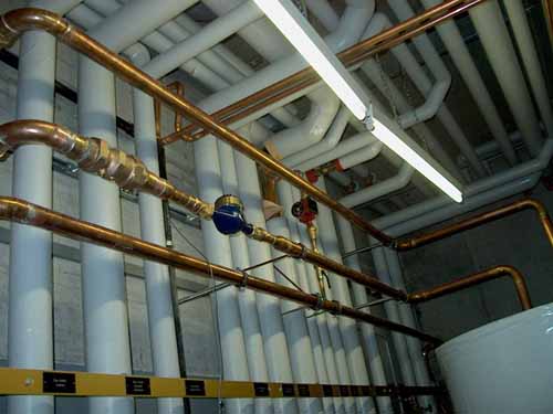 | La connexion eau chaude sanitaire est terminée, on peut y voir le clapet anti-retour en 2", ainsi que le compteur exigé par le service cantonal de l'énergie 0 |