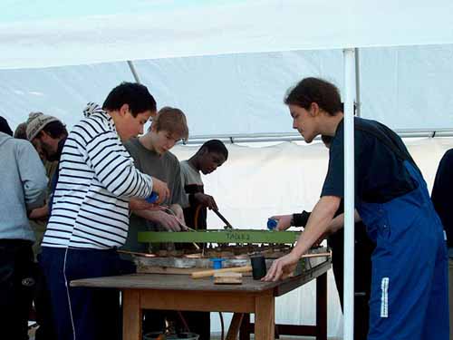 | Sébastien équipe deux jeunes prêts à en découdre avec les tubes alu qui serviront au support du champ. 0 |