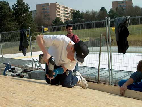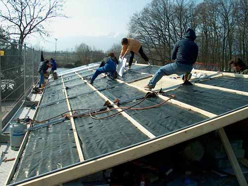 | Sur le toit, on s'active autour des plaques OSB qui serviront de support au champ. On remarque à l'avant-plan les tubes EPDM d'une ancienne installation toujours fonctionnelle qui sert à préchauffer l'eau de la piscine. Rappel : notre installation sert à préchauffer l'eau des douches et à alimenter le restaurant. Pas la piscine. L'utiliser pour la piscine, ce serait tirer au canon sur une mouche. 0 |