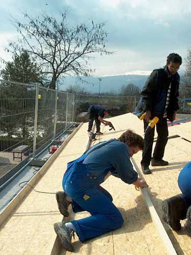 | Les ferblantiers à l'œuvre : Constantin Soutter et Sergio Mazzone, installateurs agréés pour le SPF172, dont vous pouvez voir les réalisations sur ce site. Bon ils prennent un peu la pose, là… 0 |