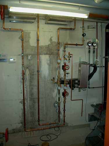 | Et tout cela va où si l'échangeur spire est inutilisable ? Mais sur un échangeur externe, pardi. Ce dernier et le groupe hydraulique primaire/secondaire sont visibles sur cette image. L'échangeur est un SWEP B28x79H/3P soit 79 plaques et trois passage, une véritable bête d'échangeur, un peu de gingois ici car on en est pas aux finitions mais ne vous en faites pas, en bons Suisses on va bientôt vous mettre tout cela gerade aus (aligné-tout-droit-couvert pour les Français qui nous liraient)... 0 |