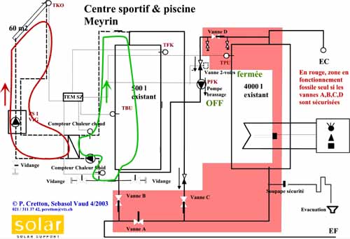 | Zoom sur l'échangeur. Note : en pleine puissance, le champ solaire de 60kW produit 50 kW thermiques. Pour cela la pompe côté solaire consomme 210W et celle du côté sanitaire 65. Donc 50'000 W de puissance thermique produits avec 275 W de puissance électrique, soit un rapport de 180. On appelle ce rapport le COP (coefficient de performance). Il s'agit ici du COP instantané le meilleur, quand l'eau à chauffer est froide et en plein été (rendement de 80% et 1 kW de puissance radiative par m2 de capteur). En moyenne annuelle, selon les simulations, le champ produira env. 40'000 kWh avec une durée d'utilisation des pompes de 3000h environs soit donc, 825 kWh, ce qui donne un COP annuel moyen de 50. Ces chiffres parlent peut-être mal au néophyte, mais ils veulent tout simplement dire qu'une installation solaire est une machine thermique incroyablement efficace. Par exemple, les meilleures pompes à chaleur eau-eau ont un COP instantané de 7 et annuel de 4.5. 0 |