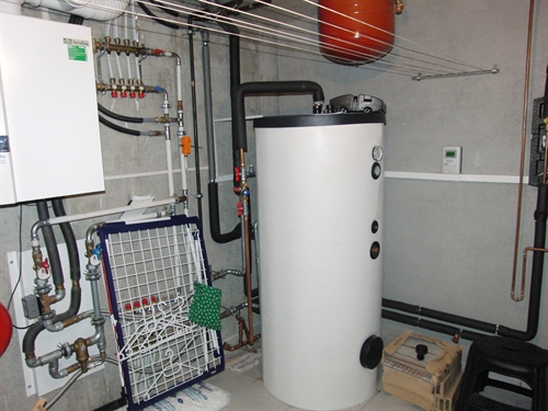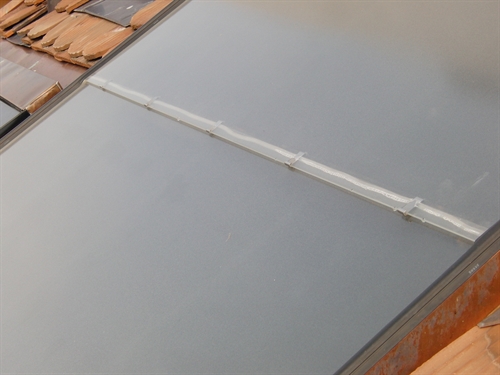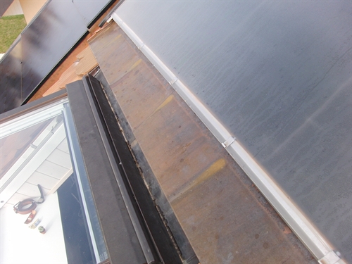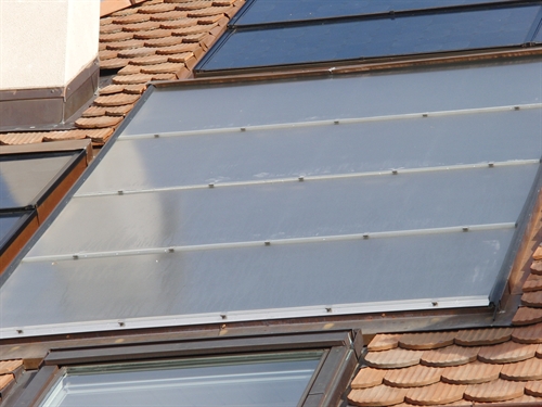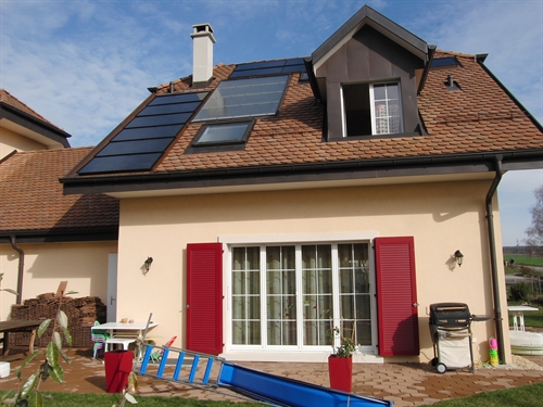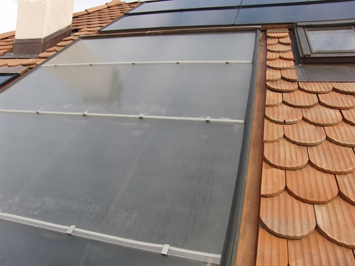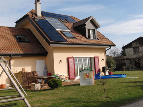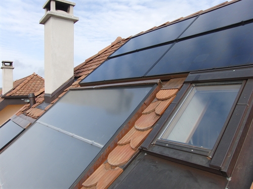 | Un bel exemple d'utilisation optimale de l'espace disponible en toiture. Les champs thermique et photovoltaïques s'imbriquent parfaitement entre eux et entre l'existant (vélux, lucarne). Autant dire qu'il à fallu bien cogiter pour pouvoir placer 6m2 de thermique et 18m2 de photovoltaïque. Grâce au choix des cellules photovoltaïques les plus performantes du marché, cette installation produit environ 3000 kWh par ans. Au total, cette toiture produit donc les 3/4 de la consommation électrique et d'eau chaude sanitaire d'un ménage moyen. |